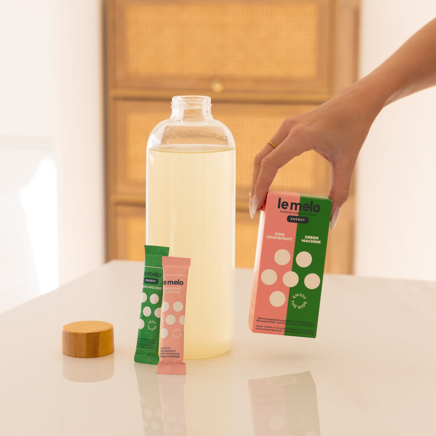 We believe that good functionality must also taste good. That's why we've developed six fruity, delicious drinks – two sugar-free and two caffeinated – that you'll love. Whether pink grapefruit for a refreshing kick, the exotic flavor of yuzu, or the summer hit watermelon – at le melo you'll find your perfect hydration that will delight you with its taste and functionality.